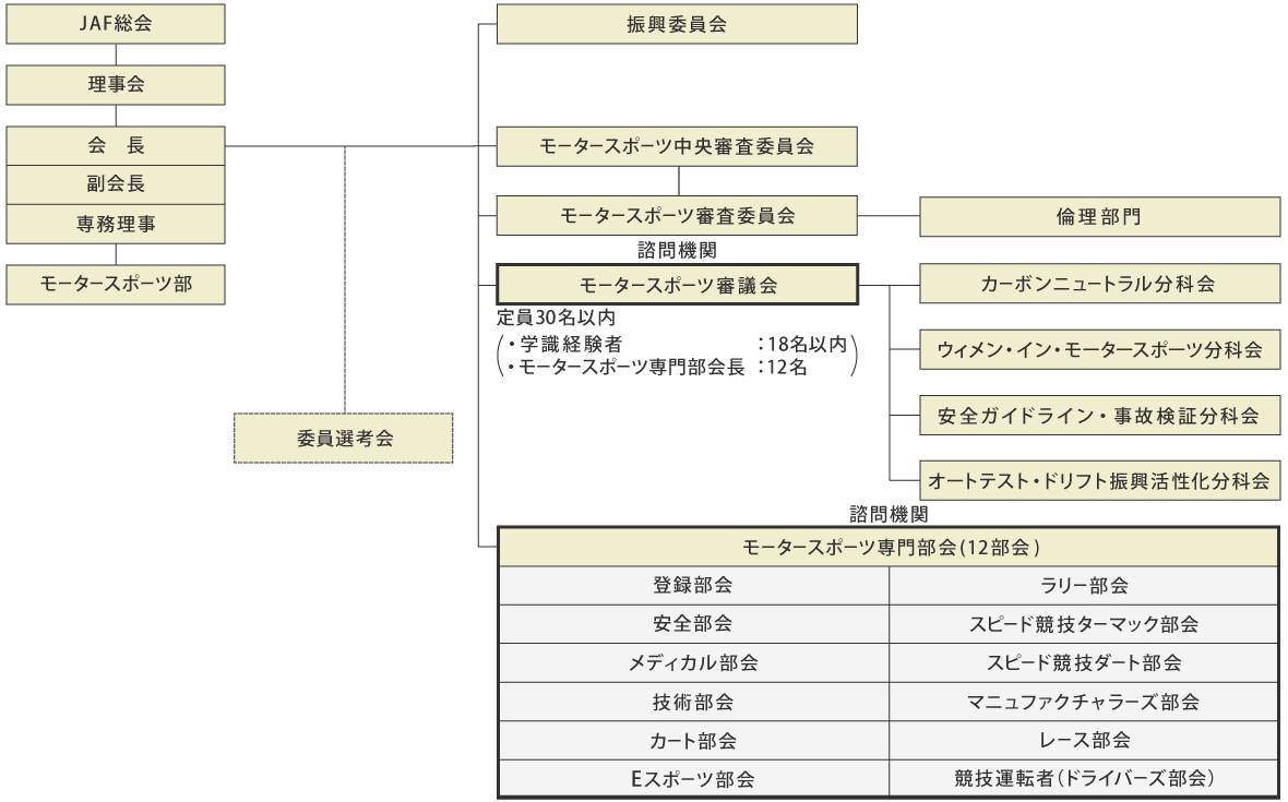 モータースポーツ諸規則の制定・改定、国際競技および国内選手権競技のスポーツカレンダーへの登録などについて、JAF会長の諮問機関として、その諮問に応じて意見の具申を行います。