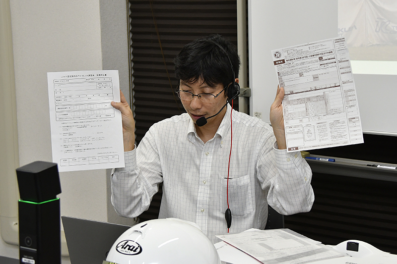 回線状況は良好で、B-Sportsがこれまで行ってきたBライセンス講習会の手順に基づいて講習会がスタートし、JAFが準備するビデオ教材を併用しながらの講義となった。講義内容を示す紙資料はデータ化され、ビデオ教材の映像もWEB会議アプリ上で共有。ヘルメット等の装備品の説明は実物をウェブカメラに示しながらの解説を行い、受講者からの質疑応答をはさみながら、指定の約2時間の講義が終了した。