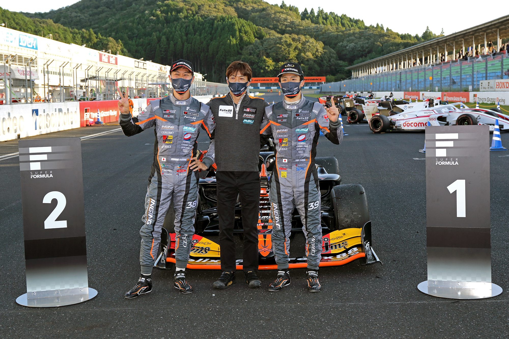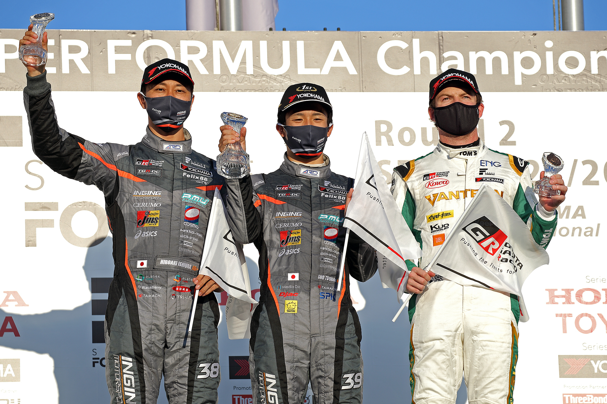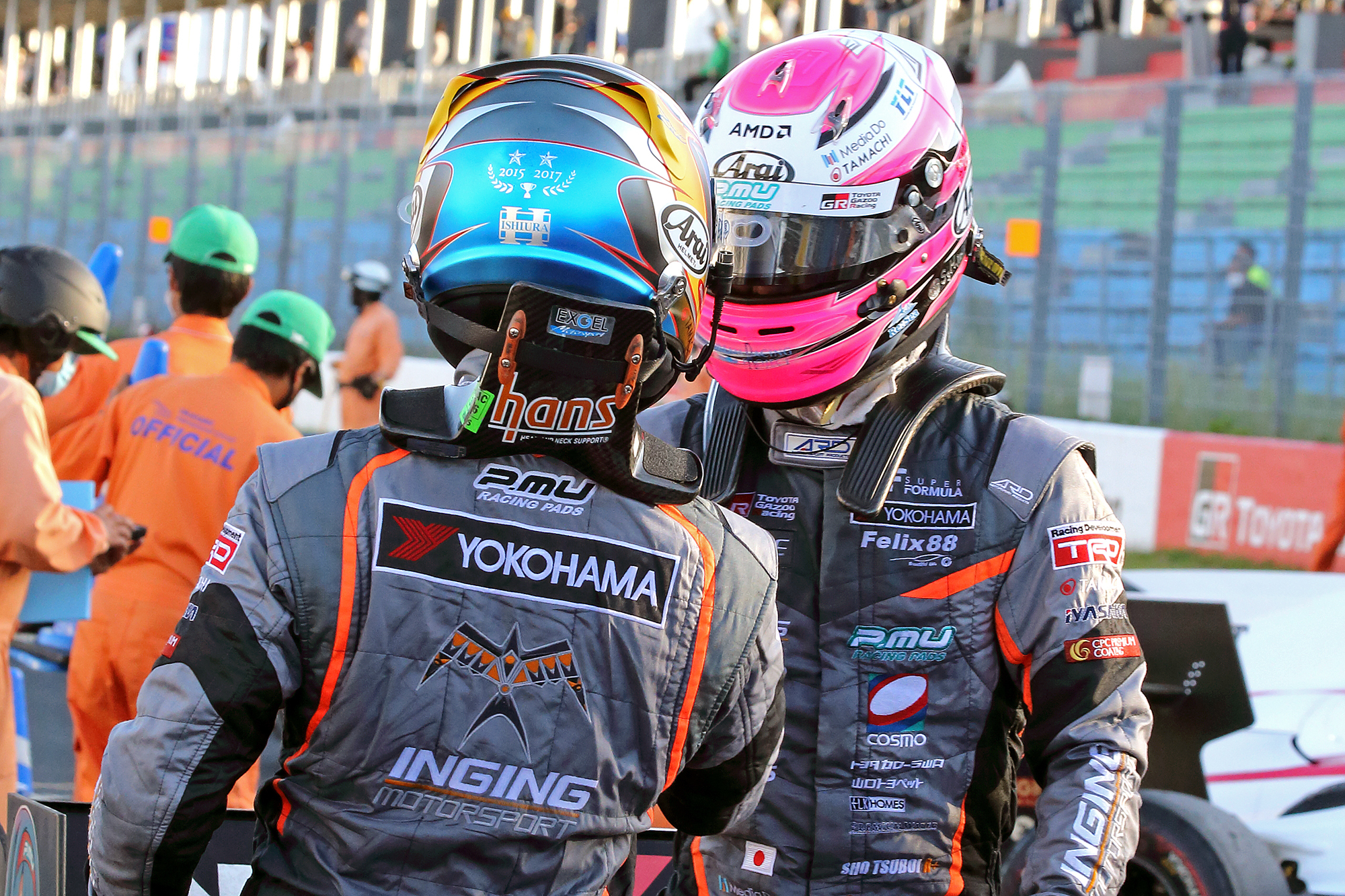 残ったキャシディ選手は47周を終えてタイヤ交換を行ったが、坪井選手と石浦選手の後方、3番手でコース復帰。残り2周を着実に走り切った坪井選手が国内トップフォーミュラで自身初のトップチェッカーを受け、2位に石浦選手が入ったことで、JMS P.MU/CERUMO・INGINGはチーム初の1-2フィニッシュを飾った。