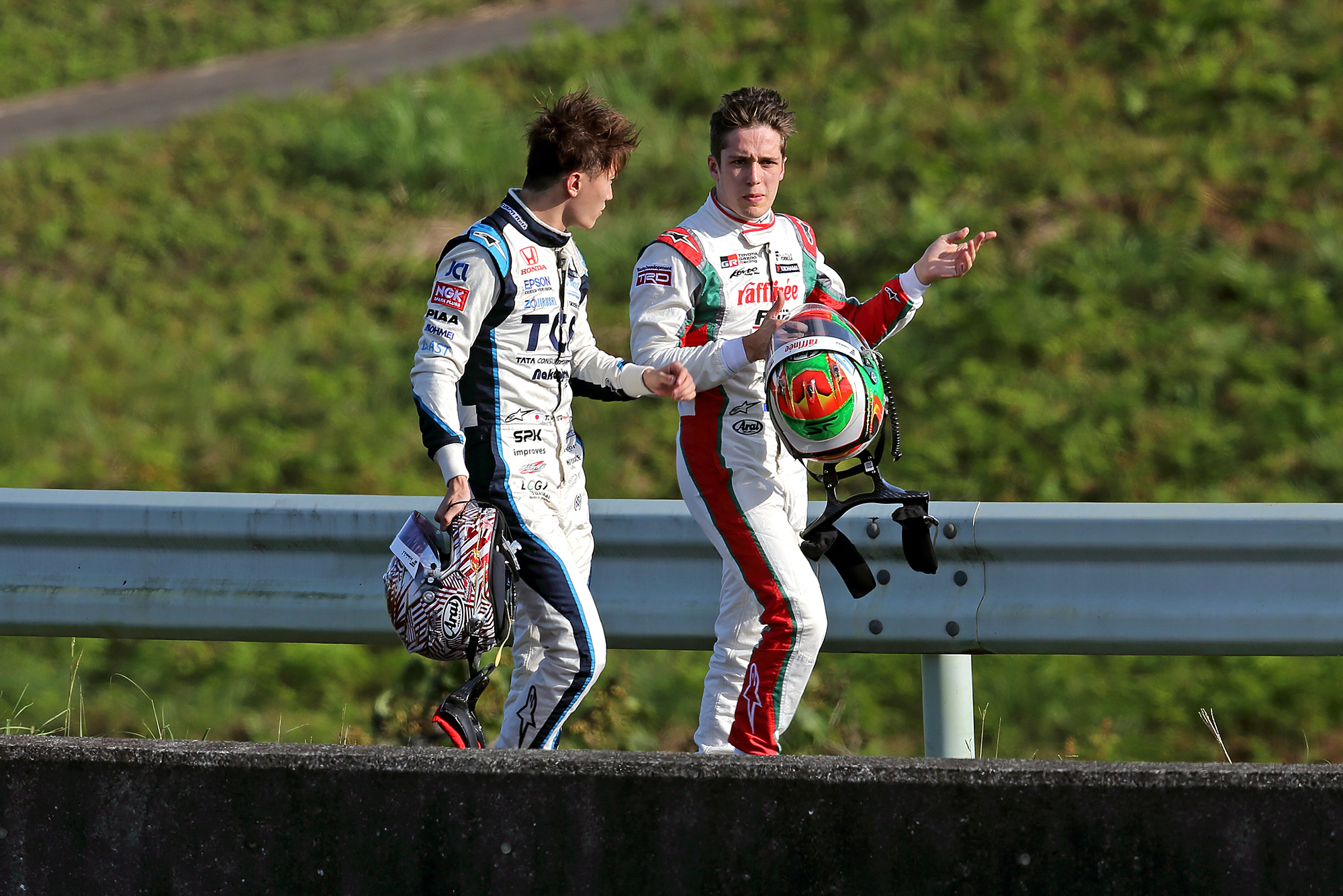 しかし、このスタートでも波乱が。5番グリッドからスタートした大湯都史樹選手(TCS NAKAJIMA RACING)が1コーナーでブレーキングミス。2列目から好スタートを切っていた牧野選手に接触してしまった。牧野選手はコース上に、そして牧野選手と絡んだフェネストラズ選手はコースサイドにストップし、リタイアとなる。レースはすぐさまセーフティカーが導入された。