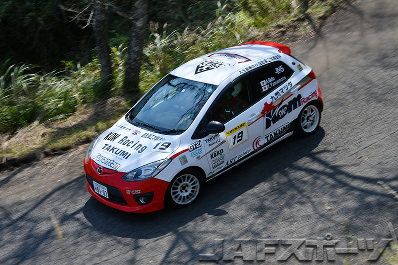 RH3クラスは、今季2勝を挙げているポイントリーダーの横手孝稀選手が不参加。同じく2勝を挙げ、ランキング2位の豊田智孝選手も主催に回ったため、本命不在の戦いになるかと思われた。しかしラリーが始まると、前戦でこのトップ2台に割って入って2位を獲得した後藤章文/山本祐介組のデミオが飛び出して、SS1、2と連続ベストをマーク。同じくデミオを駆る2番手の近藤員章/梶山剛組に8.2秒差をつけてトップでサービスに戻ってきた。