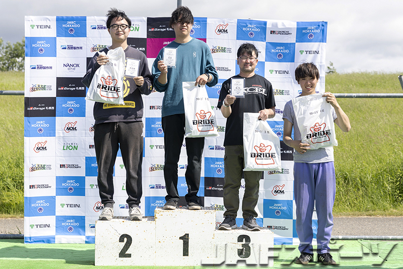 最終ゼッケンの向中野選手はプレッシャーからか、パイロンペナルティで沈んでタイムを更新できず。この結果、順位は小石選手が優勝、2位に小畑選手、3位に向中野選手となった。小石選手は、「タイヤをタテに使うようになってきたのが実を結びました。1本目は車速が速過ぎてサイドブレーキを引いてしまったのが予定外で、そこからリズムが崩れてしまいました。2本目は少しアンパイで走ったんですが、しっかりとタイムを残す走りに徹しました」と、今季初優勝の勝因を振り返った。