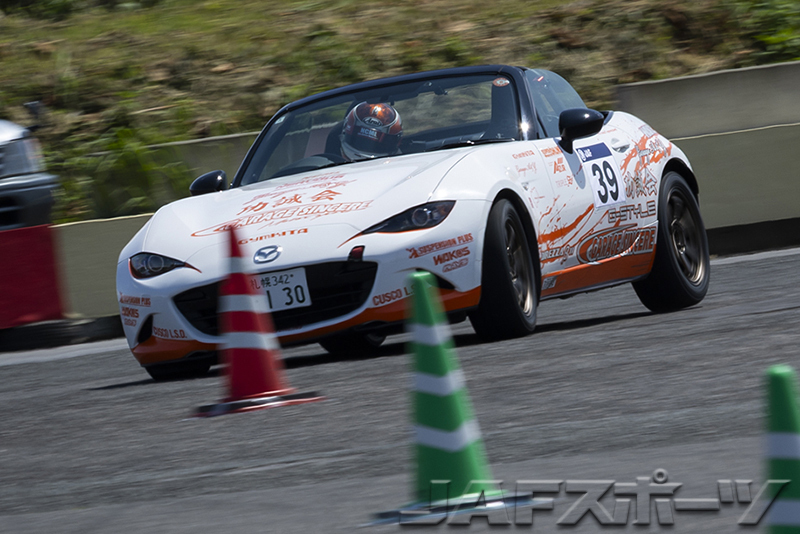 学生スラローマーたちを中心に気軽に参戦してステップアップを目指す、クローズドのオープンクラス。先手をとったのは、NA型ロードスターの川浪広大選手。ライバルたちがコース攻略にてこずっている中、トップタイムを記録する。