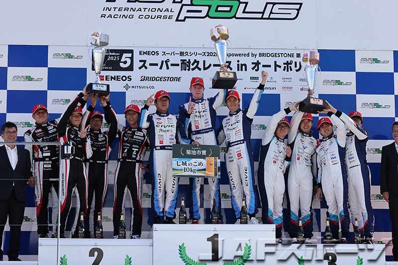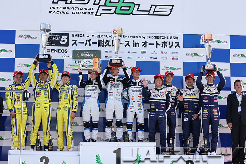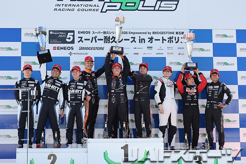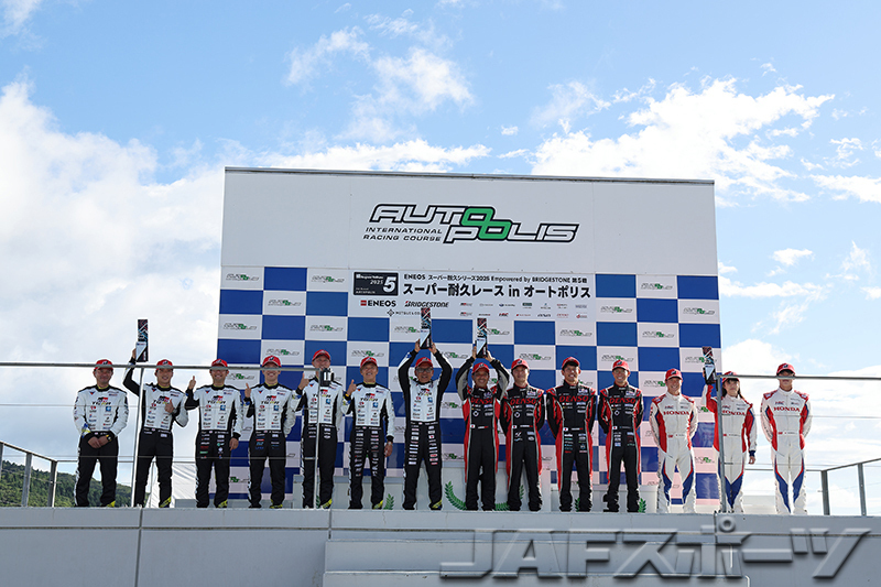 スーパー耐久シリーズ2025 第5戦は、7月25~27日にオートポリスにおいて全8クラスに48台の車両がエントリーして5時間レースとして開催された。レース終盤、総合トップを走行していたTKRI松永建設AMG GT3(DAISUKE/片岡龍也/奥本隼士/中山友貴組)が接触によりグラベルでストップ、コース復帰後はトップチェッカーを受けたがペナルティで3位に。繰り上がりでDENSO LEXUS RC F GT3(鵜飼龍大/蒲生尚弥/小林利徠斗/嵯峨宏紀組)が今季初優勝を挙げた。