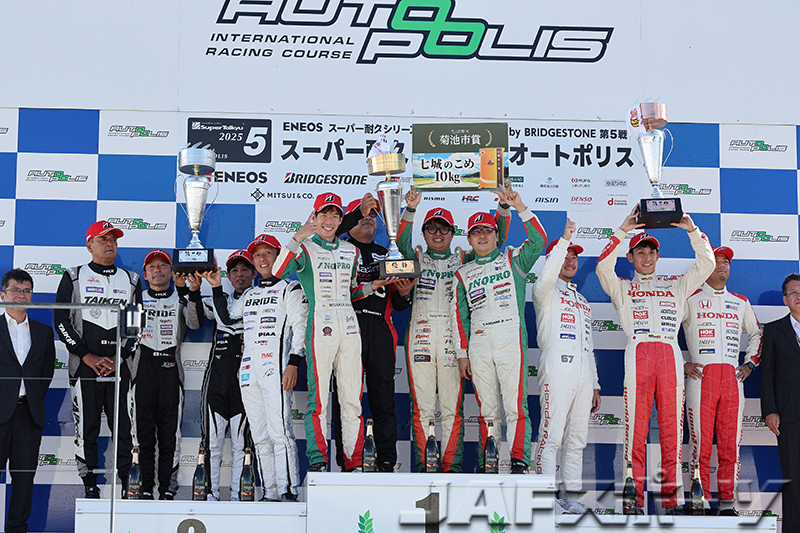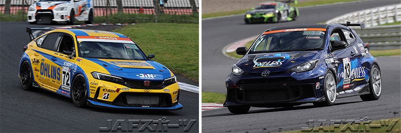ST-5Fクラス(全8台)は、残り15分を切った第2ヘアピンでTHE BRIDE FIT(太田侑弥/新井薫/瀬戸貴巨/蘇武喜和組)を抜き、トップに立ったDXLアラゴスタNOPRO☆DEMIO(加藤芳晧/小西岬/大井貴之/野上達也組)が優勝。3位でゴールしたYAMATO FIT(安井亮平/内山慎也/椋本陵組)が今季のタイトルを確定した。