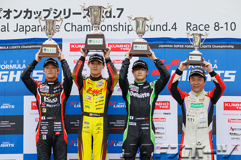 2025年スーパーフォーミュラ・ライツ選手権(SFL)の第4大会は、8月29~31日にスポーツランドSUGOにおいて第2大会(オートポリス)で延期になっていた第6戦を組み込んだ4レースが行われた。土曜日に行われた第10戦では野村勇斗選手(B-MAX RACING TEAM)がポール・トゥ・ウィンでポイントリーダーに立った。同日の第11戦と日曜日に行われた第12戦でも野村選手がポールから優勝。さらに第6戦でも野村選手が完勝して、この大会の4戦すべてでポール・トゥ・ウィンとして7連勝を飾った。
