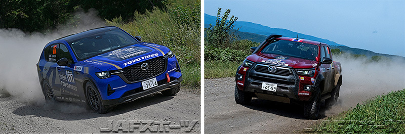 最激戦区のXC-2で、SS1“PAWSE KAMUY SHORT 1”のベストタイムを奪ったのは川畑/中谷組のトライトンで、寺川/石川組のCX-60が3.9秒差の2位につけ、番場/梅本組のハイラックスは4.8秒差の3位でまずは最初のSSを終える。続くSS2“RIKUBETSU LONG 1”は番場/梅本組が獲るが、 寺川/石川組と川畑/中谷組も僅差で続き、トップの川畑/中谷組を寺川/石川組が0.9秒差で追い、番場/梅本組も1.2秒差まで詰め寄った。