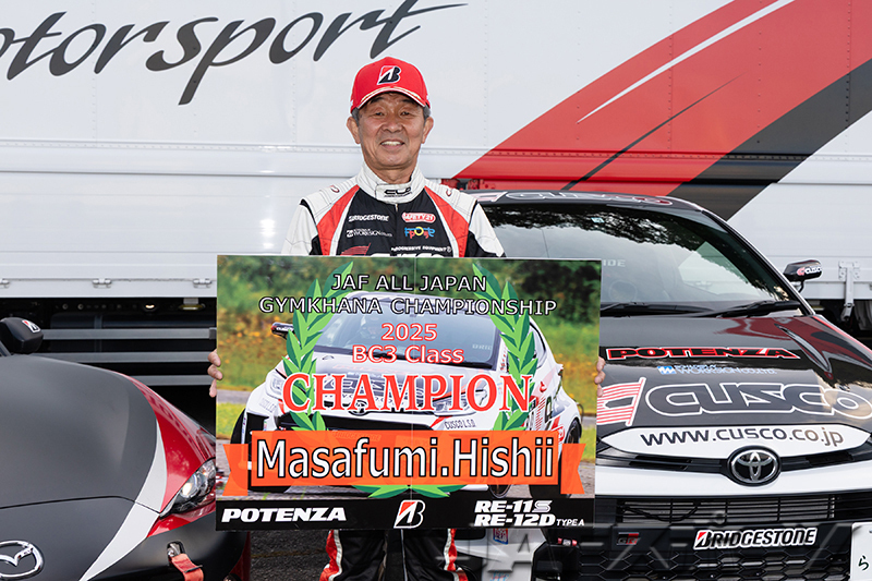 BC3クラスは、シリーズチャンピオンに王手をかけている菱井将文選手(トヨタ・GRヤリス)が、「第1ヒートは路面温度が低かったんだけど、手応えはあった」とベストタイムをマーク。さらなるタイムアップを狙った第2ヒートは「ちょっと攻めすぎた。たぶん、パイロンの縁に触ってしまったと思う」と幻のタイムに終わったが、第1ヒートのタイムで逃げ切り今季4勝目を獲得。シリーズポイントで菱井選手を追いかける奥井優介選手(トヨタ・GRヤリスGRMN)が両ヒートともパイロンペナルティで下位に沈んだため、最終戦を待たずして菱井選手が4年連続、通算18回目のシリーズチャンピオンを確定させた。