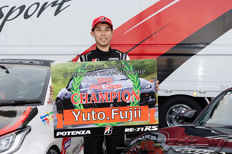PN2クラスは、シリーズランキングトップの藤井裕斗選手(マツダ・ロードスター)が、第1ヒートで1分19秒292秒のベストタイムをマーク。シリーズランキング2番手の古田公保選手(マツダ・ロードスター)が0.314秒差で追いかけるが、第2ヒートは痛恨のミスコースでベストタイム更新ならず。第1ヒートのタイムで逃げ切った藤井選手が今季4勝目を挙げた。「第1ヒートは新品タイヤの良いところをフルに使おうと集中して走りました」と藤井選手。全日本1年目にしてチャンピオンを確定させた。