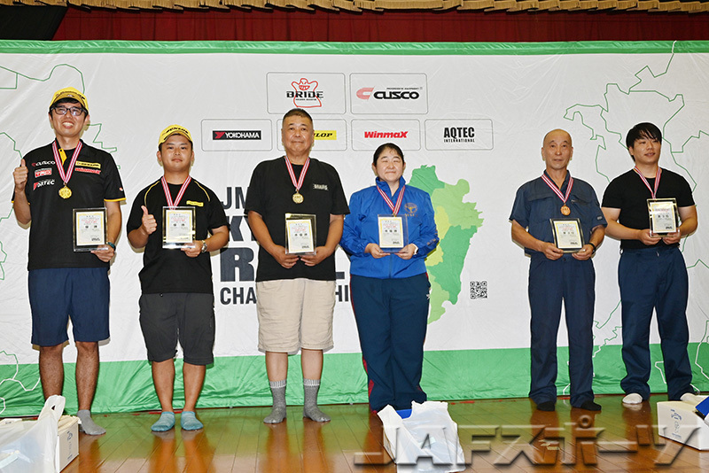 前田選手は勝利を挙げるも「2度、側溝に落ちたし、最終SSでゴールしたらタイヤがパンクしかけていたりと、実は満身創痍のラリーでした」と明かした。続けて、「フロントだけ新品(タイヤ)を履いたのが、やっぱりSS1のタイムに繋がったとは思います。黒原選手よりワンサイズ広めのタイヤを履いたのも良かったかもしれない。コ・ドライバーとのコンビネーションも良くて、いいノートがつくれたので側溝には落ちましたが(笑)、危ない所も回避できたと思います」と、勝因を分析した。
