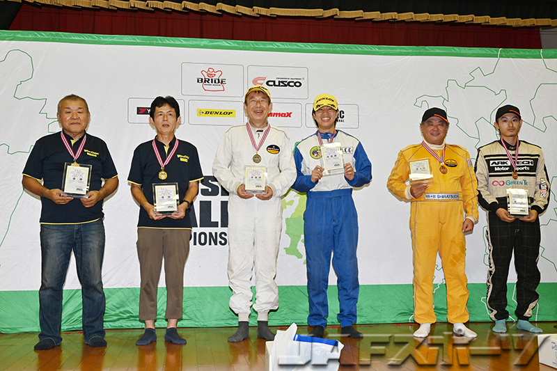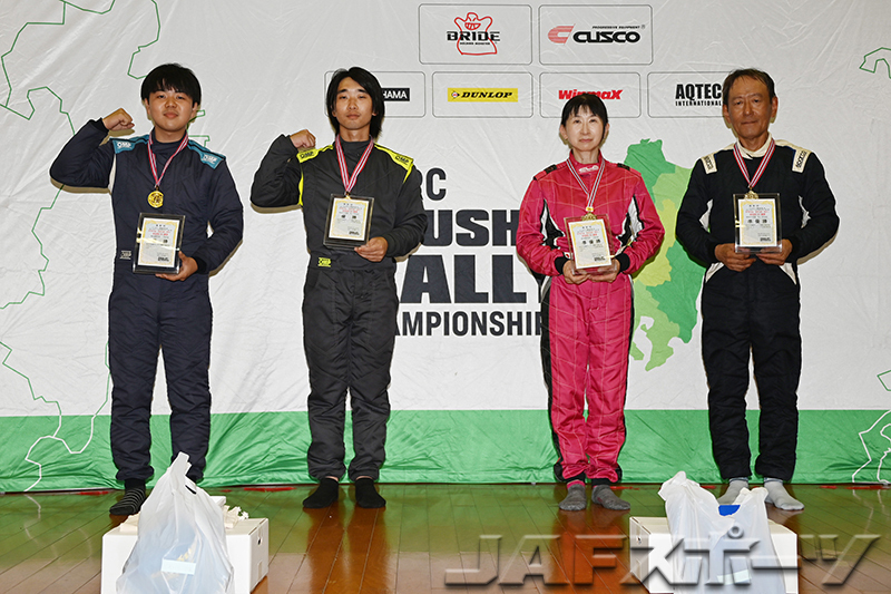 注目の若手クルー、泉勇希/WATAKEN組がフィットRSをドライブして開幕三連勝と絶好調のRH-4クラス。今季初のドライターマックでの一戦では、「SS1があまりにも遅くて、気持ちが萎えかけた」と苦戦のスタートとなった泉/WATAKEN組だったが、その後は徐々にペースを上げて快走。終わってみれば全SSベストの走りで今回のラリーも優勝を飾った。女性ドライバーの上清瑞穂選手とコ・ドライバーの内藤通孝選手のクルーが、ヤリスを駆って前戦に続いて2位を獲得した。