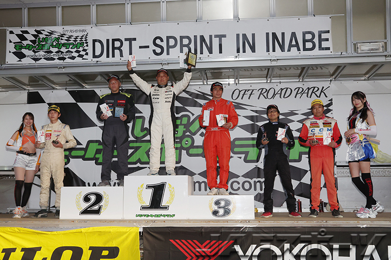 1分41秒台の攻防戦となった2位争いは、「昨年の西フェス(JMRC西日本ダートフェスティバル)で勝って以来、このコースは好きなコース。とにかく踏みまくりました(笑)」という田口和久選手(ホンダ・フィット)が入賞。太田智喜選手(トヨタ・プリウス)を0.105秒かわし、2位田口選手の0.138秒差につけたハンター大谷ヒロシ選手(スズキ・スイフトスポーツ)が3位に入賞した。