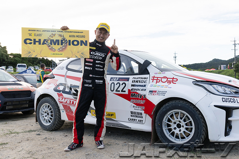 また、岸山選手とタイトルを争う宝田ケンシロー選手(トヨタ・GRヤリス)は、第2ヒートでベストタイムを更新しつつも、パイロンペナルティが加算され幻のベストタイムに。第1ヒートトップの細木智矢選手(三菱・ランサーエボリューションX)は、第2ヒートでクラッチが切れないトラブルが発生し、6位でゴール。山崎利博選手(トヨタ・GRヤリスGRMN)は8位に終わり、タイトル確定は次戦に持ち越されることとなった。