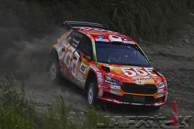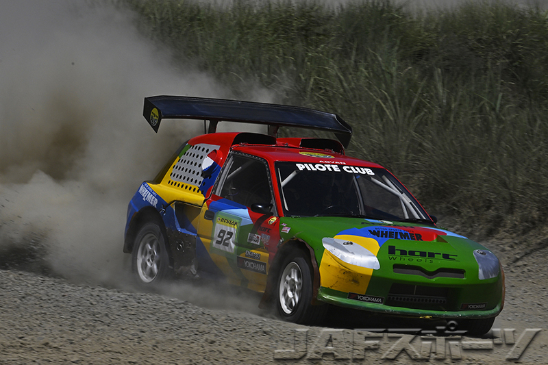 前回の第4戦で、藤本隆選手がチャンピオンを確定させているS2。第1ヒートで1分16秒948をマークしたのは、スポット参戦組でJAF全日本ラリー選手権JN1クラスが主戦場の福永修選手。本番車両のシュコダ・ファビアRSラリー2を持ち込み、豪快な土煙を上げながら圧倒的なタイムでトップを奪った。
