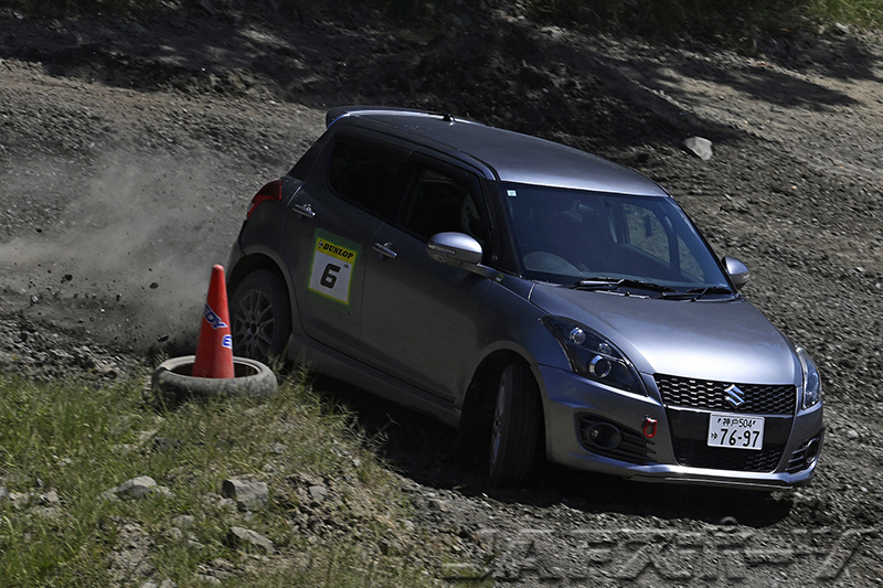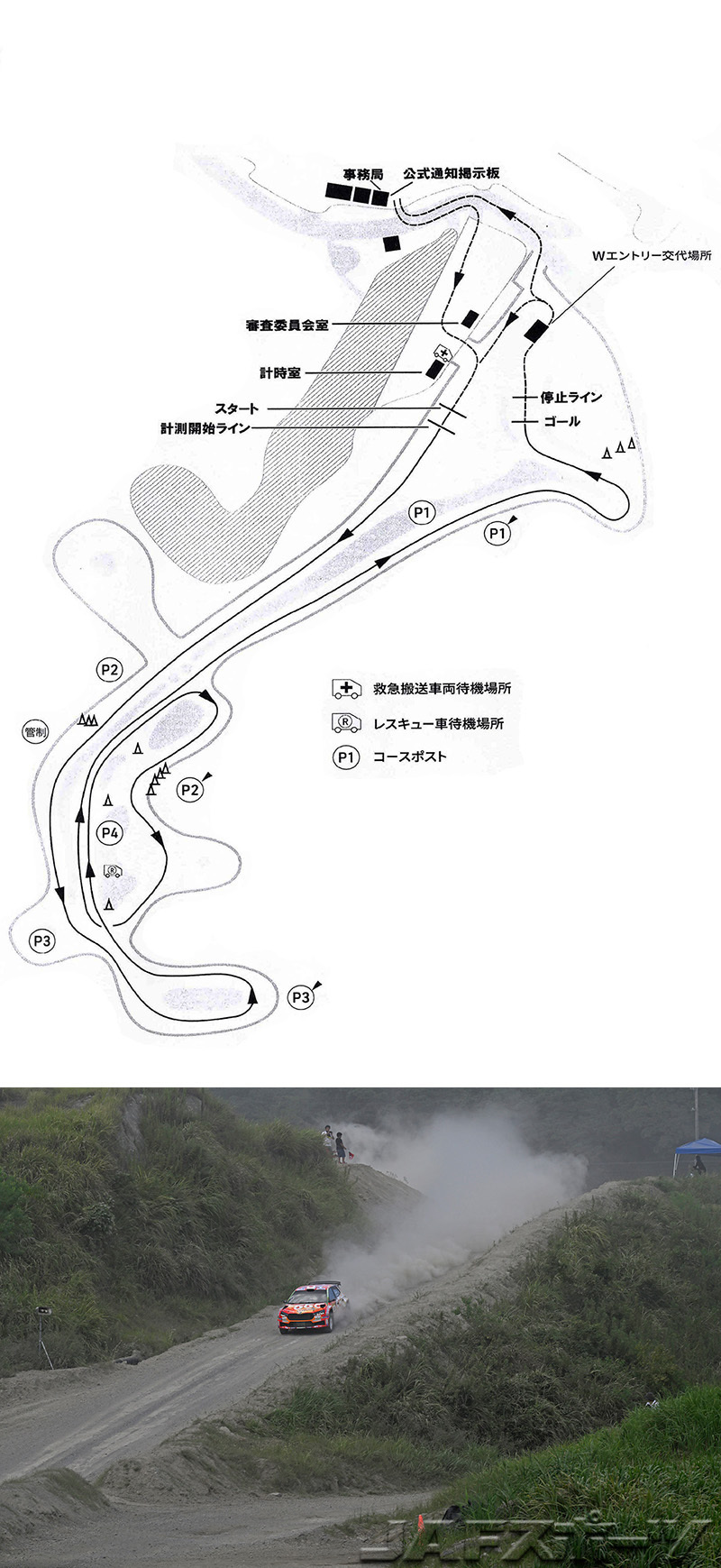 最終決戦のレイアウトはスタートとフィニッシュの位置が、これまでいなべで開催されてきたダートラ競技会とは異なる逆走レイアウトを採用。スタート直後から急勾配を下り、そのままコースの奥まで一気に駆け抜ける、細心のスピードコントロールが要求される設定となった。