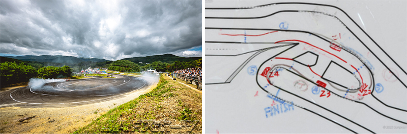 予選を兼ねた単走には全33台が出走した。審査区間は先月当地で開催されたD1ライツとほぼ同じで、逆振り進入が強制となる1セクター。そしてアウト側に配置されたゾーン1から2セクターのゾーン2に繋げるラインが去年とは異なりイン側に配置された。このため、時速145~150km近傍での速度からS字の振り返しを伴って一気に減速するブレーキ&ラインメイクの技術を問う審査区間となった。