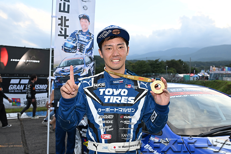 第5戦と同じレイアウトで開催された翌日の第6戦。横井昌志選手(TEAM D-MAX RACING)が唯一の98点台をマークして、小数派となったシルビア系エントラントの中で意地を見せたが、その後走った松山北斗選手(Team TOYO TIRES DRIFT 2)が唯一となる99点台を叩き出して単走優勝を遂げた。