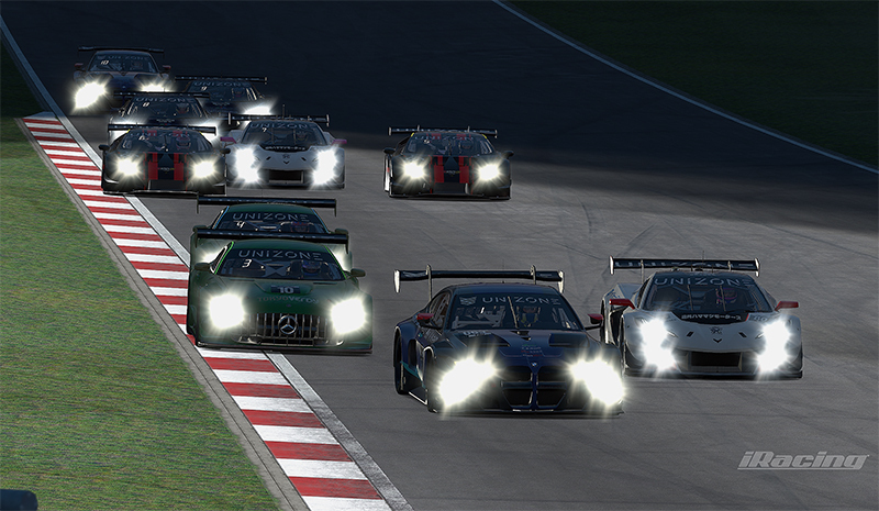 UNIZONE最終戦の中で最後のレースとなるスプリントレース⑤。スーパー耐久シリーズの富士24時間レースを連想させるようなナイトセッションの中、フルリバースグリッドでレースがスタートした。先頭でスタートを切った小山選手(群馬ダイヤモンドペガサス)を、東京ヴェルディレーシングの佐々木選手と木村選手が1周目のアドバンヘアピンで攻略し、チーム1-2体制を築く。
