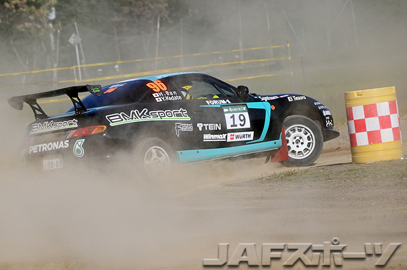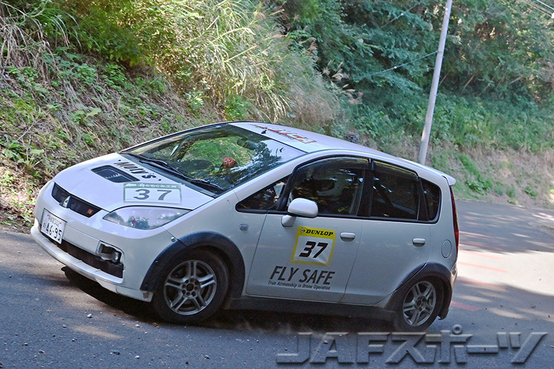 ヤマが減ったドライ用ラリータイヤを履いた小舘/松本組はSS1で順調にベストを奪うが、SS2“葉山1”はグラベルを得意とする、木下聡/佐瀬拓野組が三菱・ミラージュを操って0.8秒差で小舘/松本組を下してベストを獲る。
