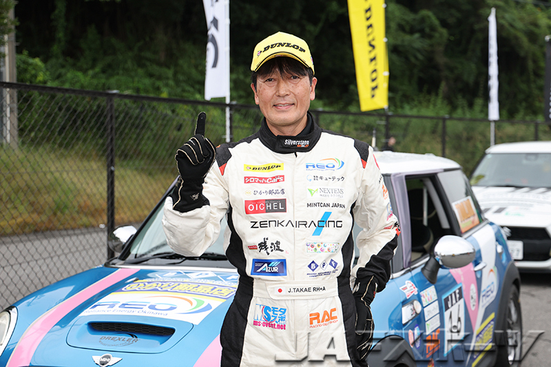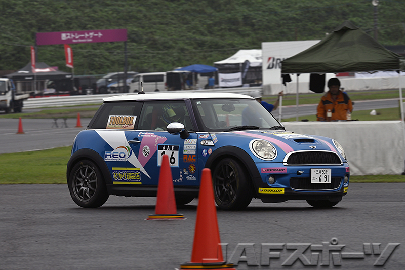 PE2クラスは、ハーフウェットの第1ヒートでクラス唯一となる1分25秒台のタイムでトップに立った高江淳選手(BMW・ミニ・クーパーS)が、第2ヒートでもベストタイムを更新。「ドライ路面の第2ヒートもベストタイムを更新できたことが大きかったですね」という高江選手が、今シーズン2勝目を獲得した。