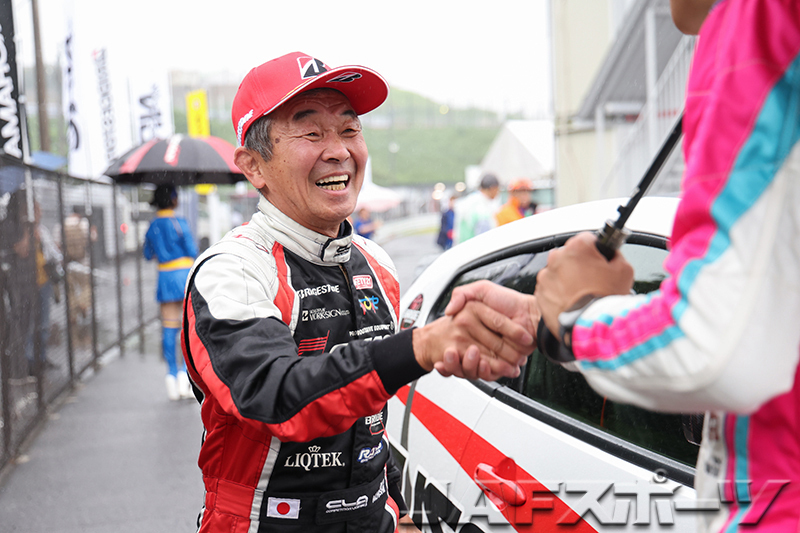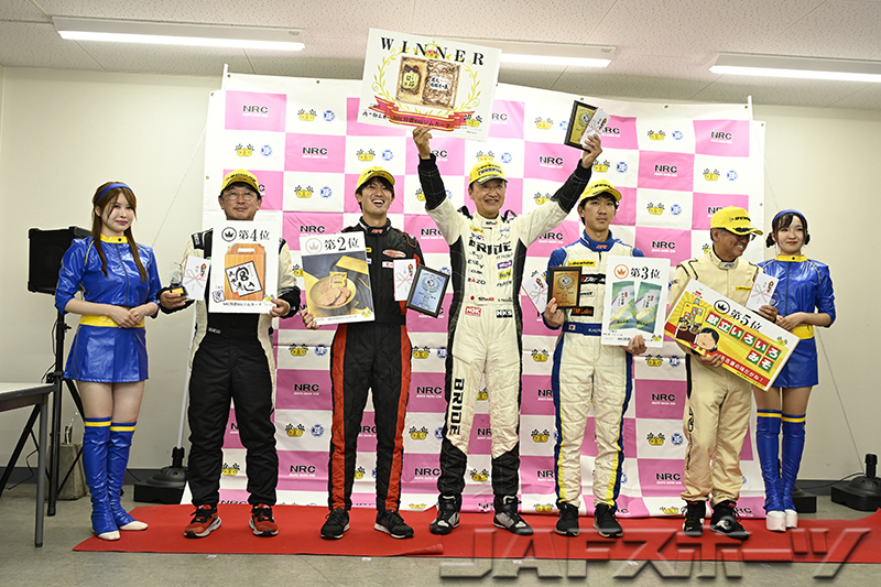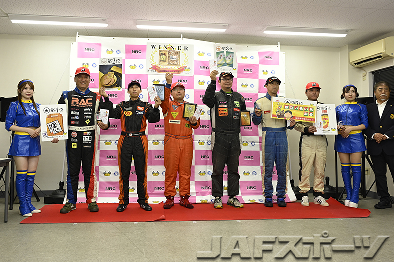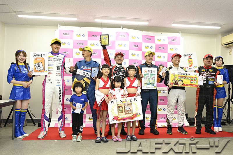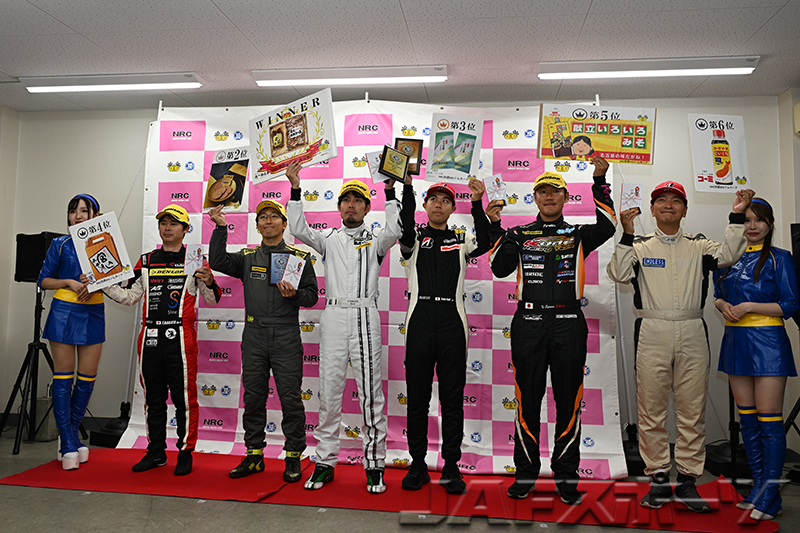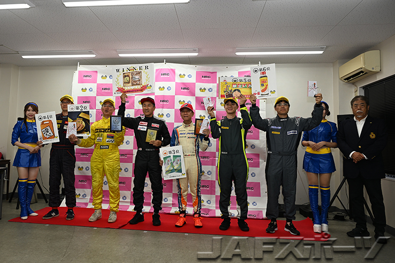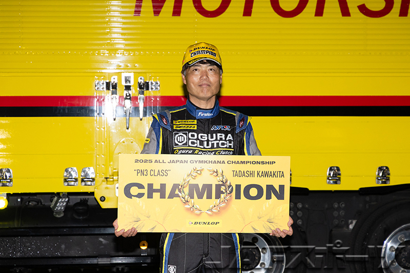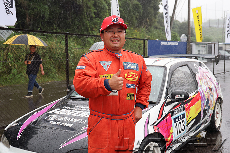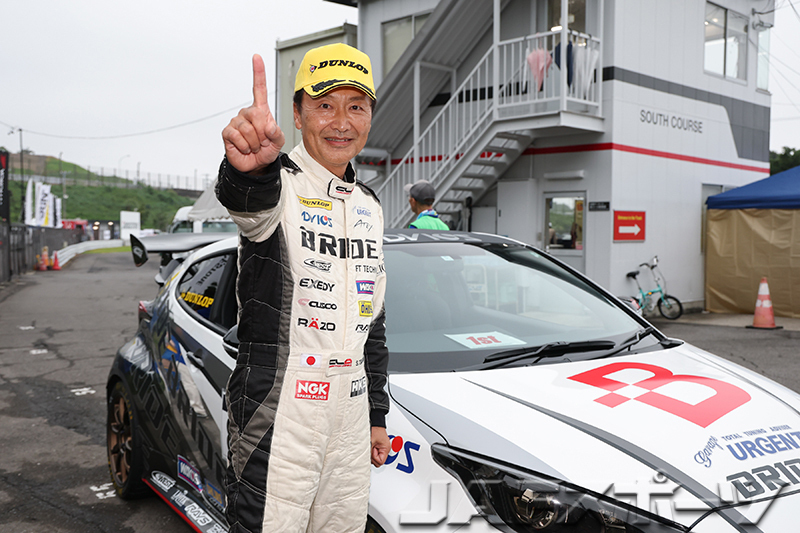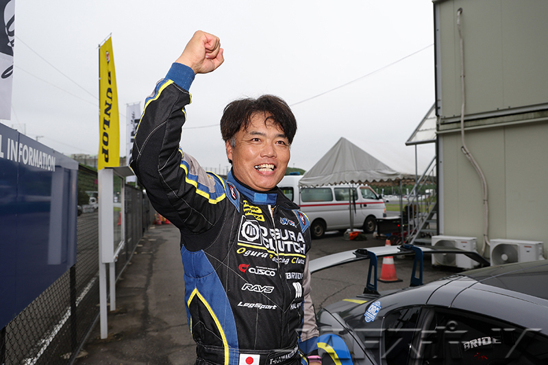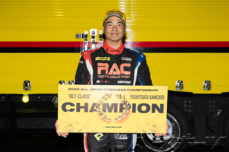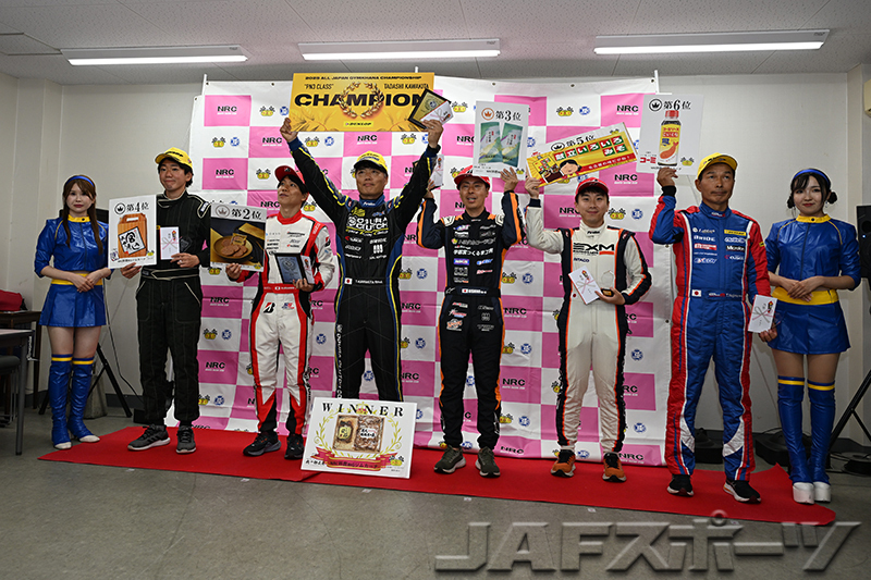 注目のチャンピオン争いは、第7戦を終えて神里選手と同点トップの西井将宏選手(ホンダ・インテグラ・タイプR)が第1ヒートをDNFで終わり、雨に翻弄された第2ヒートは下位に沈む中、第1ヒートのタイムで10位となった神里選手が有効得点に1点を加算。わずか1点差で、神里選手が自身初となるシリーズチャンピオンを確定させた。