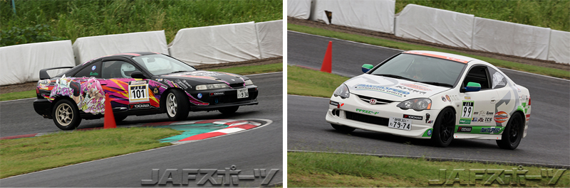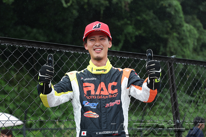 白熱の第2ヒートは1分17秒台の攻防戦となり、第1ヒート5番手の山越義昌選手がベストタイムを更新したころから雨が降り出し、路面はまたたく間にヘビーウェットコンディションへと変化していく。このコンディションに、第1ヒートトップの神里選手、2番手の伊藤選手は大幅にタイムダウンとなり山越選手が今季初優勝を獲得。「雨がポツポツ来ていたので、もう攻めるしかないと思いました」という清水翔太選手(ホンダ・インテグラ・タイプR)が開幕戦以来の表彰台となる2位に入賞。今シーズンから全日本にフル参戦している牧田祐輔選手(ホンダ・インテグラ・タイプR)が初表彰台となる3位となった。