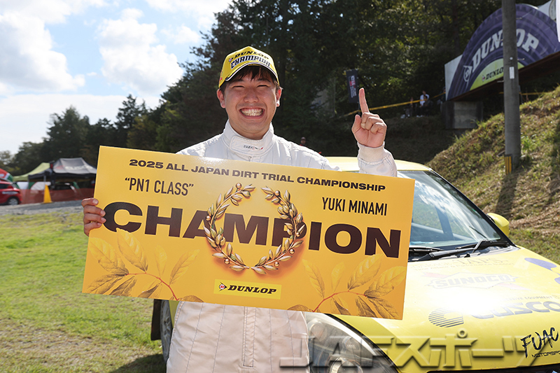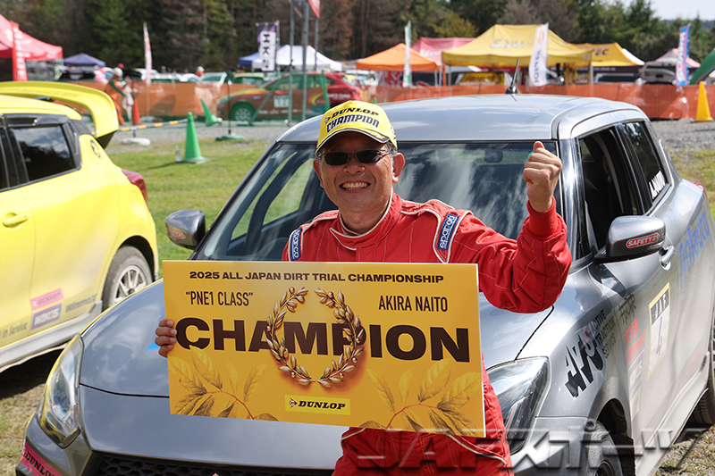 エントリーした6台中、4名のドライバーがチャンピオンの可能性がある状況となったPNE1クラスは、シリーズランキングトップにつける内藤聡選手(スズキ・スイフトスポーツ)が、両ヒートでベストタイムをマーク。「第1ヒートは走りづらさがあったんですけど、路面コンディションがどんどん良くなったので、第2ヒートは思い切ってセッティングを変えたことが結果につながりました。ダートトライアルに復帰するまでにいろいろな道程があって、過去の結果はまったくなしと考えてもいい状態だったので、チャンピオンは本当にうれしいです」という内藤選手が、2014年以来11年ぶり4回目となる全日本チャンピオンを確定させた。