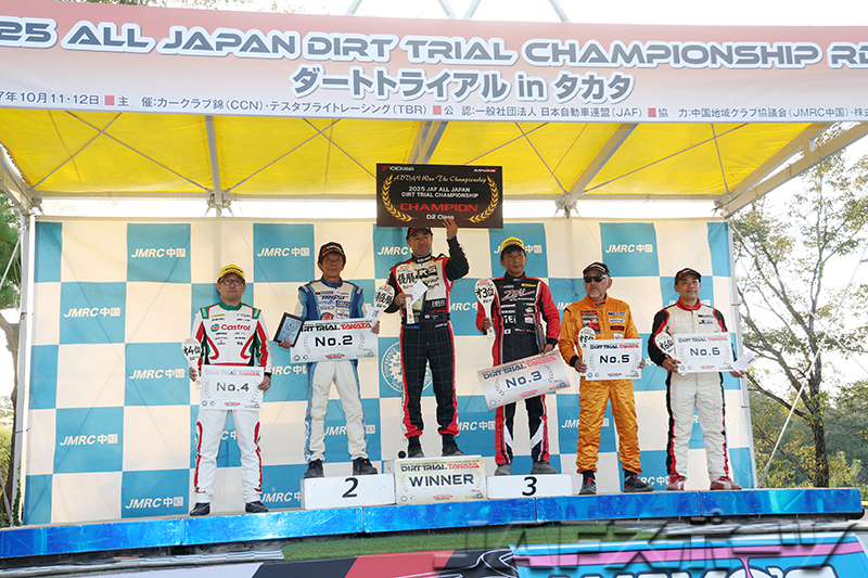 D2クラスは、第6戦で3年連続チャンピオンを確定させた田口勝彦選手(三菱・ランサーエボリューションⅩ)が、両ヒートでライバル勢を1秒以上引き離すタイムを叩き出し、今季6勝目を獲得。有効得点で満点チャンピオンを確定させた。2位には、「いろいろと仕様変更してきたことが少しずつ結果に結び付いてくるようになったけど、まだまだ(田口)勝彦が速いね。来シーズンも頑張ります」という谷田川敏幸選手(スバル・BRZ)が入賞。「ラインに乗せるのが精一杯。タイヤ選択を失敗しました」という炭山裕矢選手(三菱・ミラージュ)が3位だった。