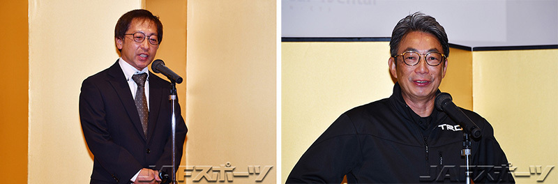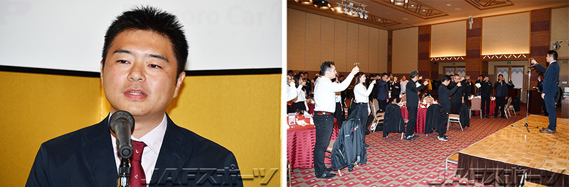 式典は、冒頭に今季を振り返るダイジェスト映像が流された後に、XCR 北海道の小池治郎事務局長による開会の挨拶で幕を開けた。続いて株式会社トヨタカスタマイジング&ディベロップメント営業企画本部事業管理部事業創造室の室長である、高橋秀利氏が来賓を代表して挨拶。そして、横浜ゴム株式会社タイヤ消費財商品企画部課長補佐である内山貴史氏による音頭で乾杯が行われた。