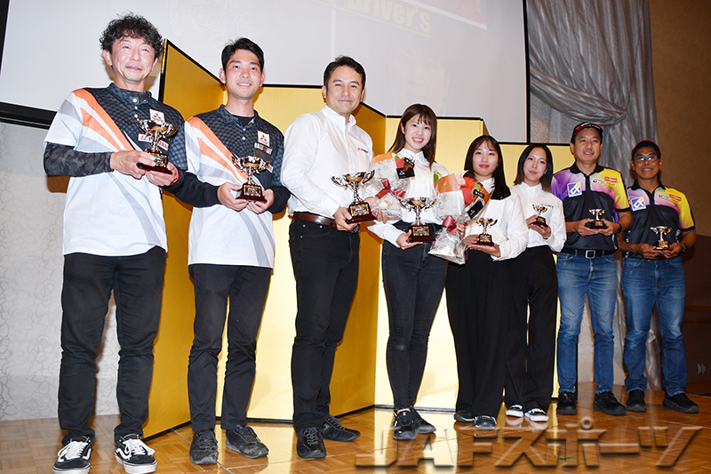 XC-3クラスは、第2戦から4連勝を飾った藤野選手がドライバー部門のチャンピオンカップを手にした。最終戦で今季2度目の2位を獲得した相原泰祐選手がシリーズでも2位に入り、開幕戦を制した奈良選手が3位で表彰を受けた。コ・ドラ部門では藤野選手と同じく、D1GPとの二刀流に挑んだ玉城選手が藤野選手と組んで4勝を挙げて、ともに初のXCR北海道チャンピオンに輝いた。相原選手のコ・ドラを務めた上原あずみ選手が2位、奈良選手と組んだ花⽥選手が3位で表彰された。
