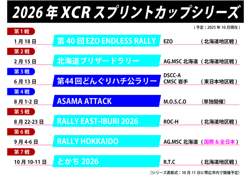 今季のXCR北海道は、9月下旬に開催が予定されていた第5戦「RALLY EAST-IBURI 2025」が悪天候により中止となったため、当初の予定から1戦減った5戦のシリーズとなった。まず2025年JAF北海道ラリー選手権と併催された序盤2戦はスノーラリーで競い、2025年JAF全日本ラリー選手権の第5戦「2025 ARKラリー・カムイ」と併催した第3戦からはグラベルラウンドへと突入した。