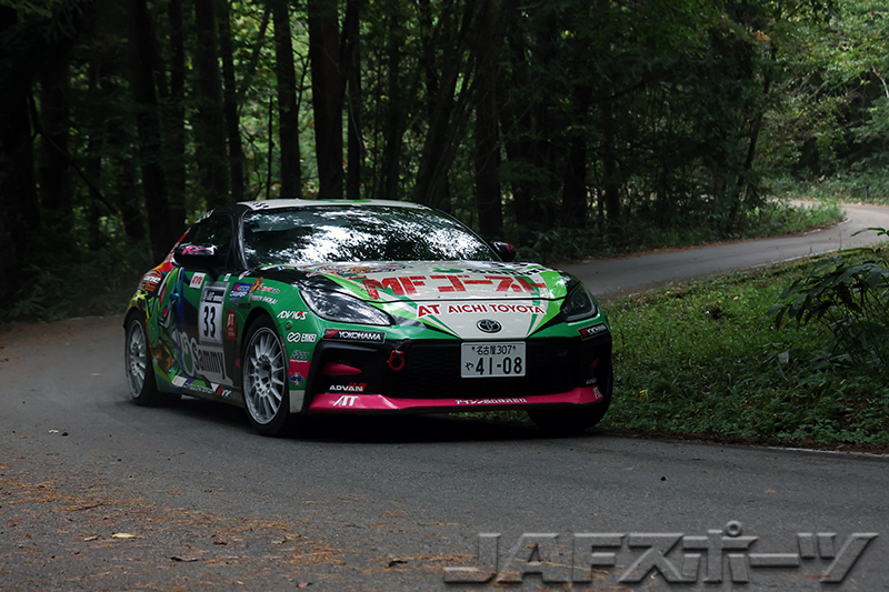 JN-3クラスは、SS1で鈴木尚/島津雅彦組(スバル・BRZ)がベスト、SS2で上原淳/漆戸あゆみ組(スバル・BRZ)がベスト、SS3で山口清司/竹原静香組(トヨタ・GR86)がベスト、SS4で窪啓嗣/藤口裕介組(トヨタ・GR86)がベスト、SS5で上原/漆戸組がこの日2回目のベストという混戦模様となった。「たぶん、他の選手はドライタイヤだったと思うんですけど、うちのチームだけウェットで行きました。SS6の直前に雨が降ってきて、それが最後に当たったと思います」という、すでに今季のチャンピオンを確定させている山本悠太/立久井和子組(トヨタ・GR86)がSS6でベストを奪い、レグ1をトップで折り返す。