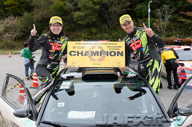 JN-4クラスは、第6戦の3位入賞でチャンピオンを確定させた高橋悟志/箕作裕子組(スズキ・スイフトスポーツ)と、「シリーズ2位のチャンスがあるので」と出場した鮫島大湖/船木佐知子組(スズキ・スイフトスポーツ)がSS1からベストを奪い合う展開となったが、SS5で鮫島/船木組がコースアウト。「レグ1はウェットタイヤをスペアで積んで行ったんですけど、JN-1のタイムを見て『これはウェットだ、履き替えなくては!』と思った時にはスタートまで10分を切っていたので、交換するのを諦めました」という高橋/箕作組が、ラリー2日目は6ステージすべてでベストを奪い、今季3勝目を獲得した。