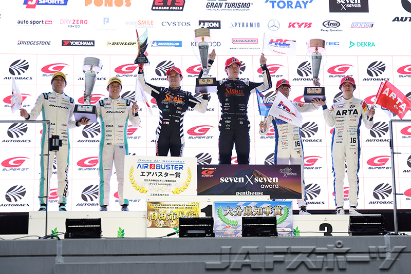 終盤はホンダのトップ3に変わりはなく、牧野選手が2番手争いを演じる2台との距離を広げて完全な独走態勢に。最終盤の101周目の100RでModulo CIVIC TYPE R-GTの大草選手が2位を奪い102周でチェッカー。STANLEY CIVIC TYPE R-GTが今季限り(来季はプレリュードを投入予定)で役目を終えるシビックの今季初優勝を成し遂げ、シビックが表彰台を独占した。STANLEY CIVIC TYPE R-GTは最初のスティントを山本選手がタイヤを労わりながら長く担当し、残りの2つのスティントを牧野選手が攻めて走った。日産とトヨタのトラブルもあったが、ホンダファンを歓喜させる作戦勝ちのレースだった。