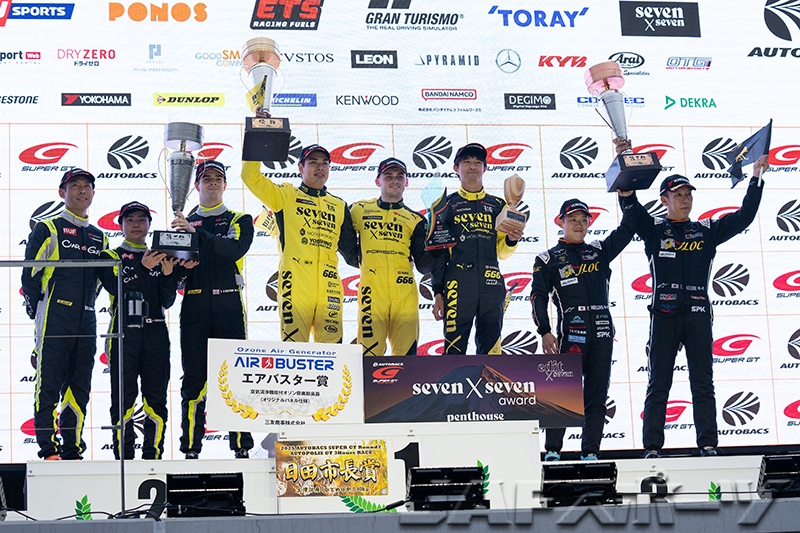 3時間のタイムレースは95周でチェッカー。今季スーパーGTに新規参戦したseven × seven PORSCHE GT3Rが初優勝を遂げた。2位はCARGUY FERRARI 296 GT3、3位はVENTENY Lamborghini GT3だった。ポイントリーダーのLEON PYRAMID AMGは6位でランキングトップを死守、リアライズ日産メカニックチャレンジGT-R(ジョアオ・パオロ・デ・オリベイラ/平手晃平組)が4位に入り、LEON PYRAMID AMGとのポイント差をわずか1.5点差に縮め、タイトル争いは9台に絞られた。