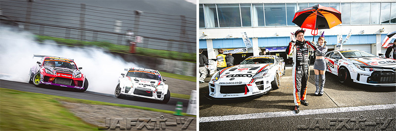今季のシバタイヤユーザーの勢いは目覚ましく、ランキング2位の藤野選手(トーヨー)と5位の中村直樹選手(TEAM VALINO × N-STYLE:ヴァリノ)を田中省己選手(SEIMI STYLE SHIBATIRE DRIFT:シバタイヤ)が破り、ランキング4位の目桑宏次郎選手(VALINO TEAM G-Meister:ヴァリノ)を日比野哲也選手(SHIBATA RACING TEAM:シバタイヤ)が破ったことで、ランキングトップの蕎麦切選手(シバタイヤ)を援護射撃。田中選手はオートポリスで3年連続の決勝戦進出となり、今度こそはと初優勝を期待されたが、自身のミスによる接触でまたも優勝を逃してしまった。