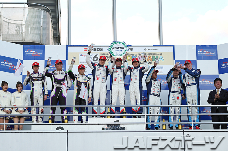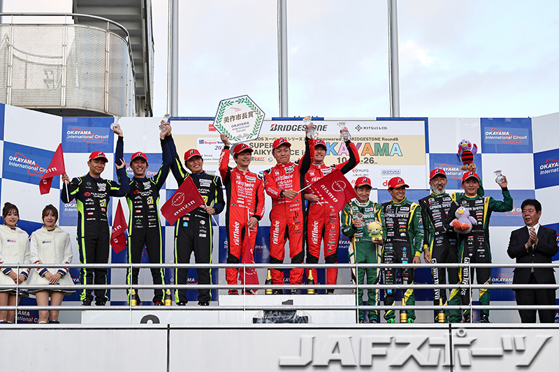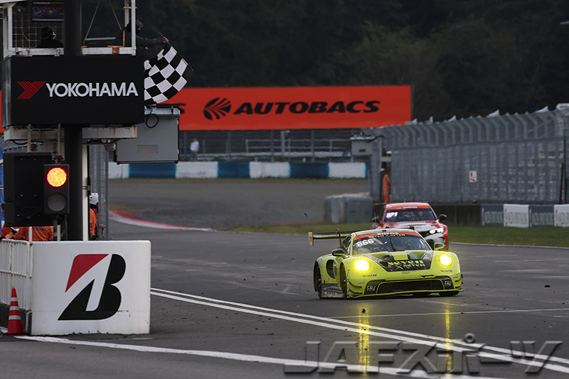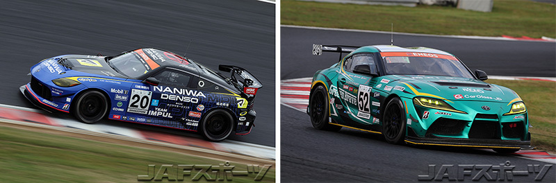 2位にはNANIWA DENSO TEAM IMPUL Z(松本貴志/大木一輝/平峰一貴組)がゴールし、フェアレディZが1-2フィニッシュを決めた。今回Aドライバーを変更して3位でチェッカーを受けた埼玉 GB GR Supra GT4 EVO2(松井宏太/吉田広樹/服部尚貴/野中誠太組)は、最終戦を待たずに3年連続のチャンピオンを確定した。
