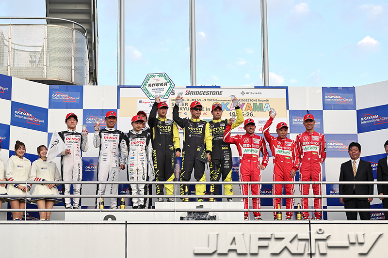 10月25~26日に岡山国際サーキットで行われたスーパー耐久シリーズ2025 第6戦は、グループ別の2レースで開催。ウェットコンディションの午前中に行われたGr.2のレースは、ST-2クラスのKTMS GR YARIS(富下李央菜/鈴木斗輝哉/平良響組)が総合優勝。午後に行われたGr.1のレースでは、3戦ぶりにエントリーしたseven × seven PORSCHE GT3R(BANKCY/渡会太一/藤波清斗組)がポール・トゥ・ウィンで今季参加した4戦中3勝目を挙げた。