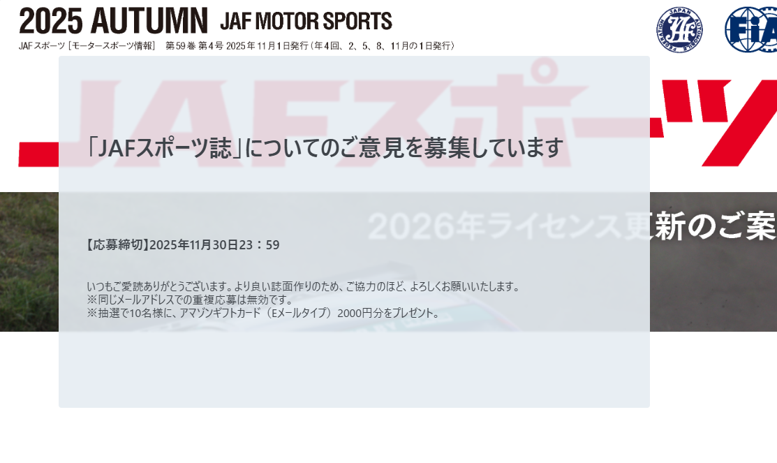 ライセンスホルダーやモータースポーツ愛好家に送付しているJAFスポーツ誌。11月1日発行の「2025秋号(AUTUMN))」はもうお読みになりましたか? 同誌上では、より良い誌面作りに役立てるため、読者アンケートを実施中です。まだまだ締切に間に合います。ご応募お待ちしております。