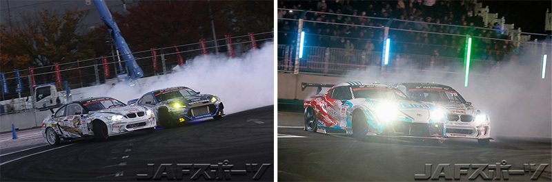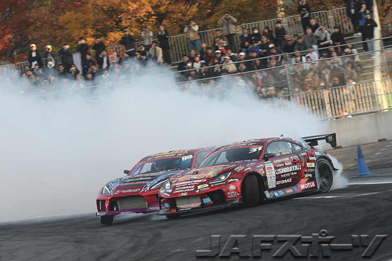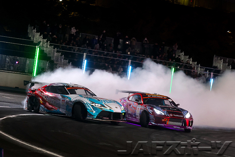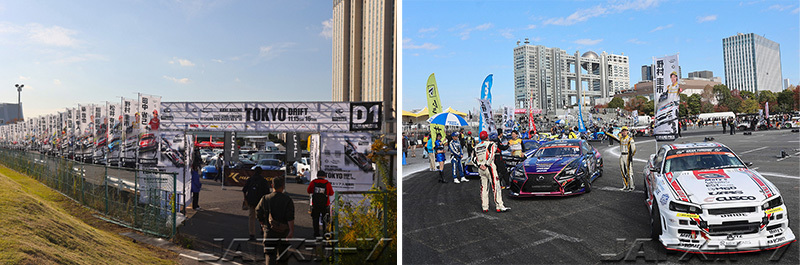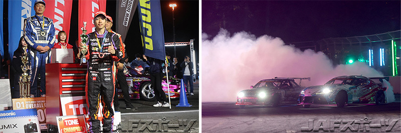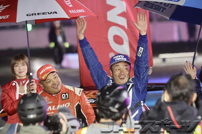 D1グランプリシリーズは、チャンピオン争いが3名に絞られ、首位の蕎麦切広大選手と藤野秀之選手が20ポイント差で迎えた最終ラウンド・お台場。参戦6年目の蕎麦切選手が悲願の初戴冠となる可能性が高いものの、お台場を得意とする藤野選手が奇跡の逆転で3度目のチャンピオンとなる可能性もゼロではない。文字通り最後の1走までタイトルの行方が分からない、最終戦にふさわしい伝説的な2日間となった。