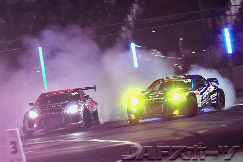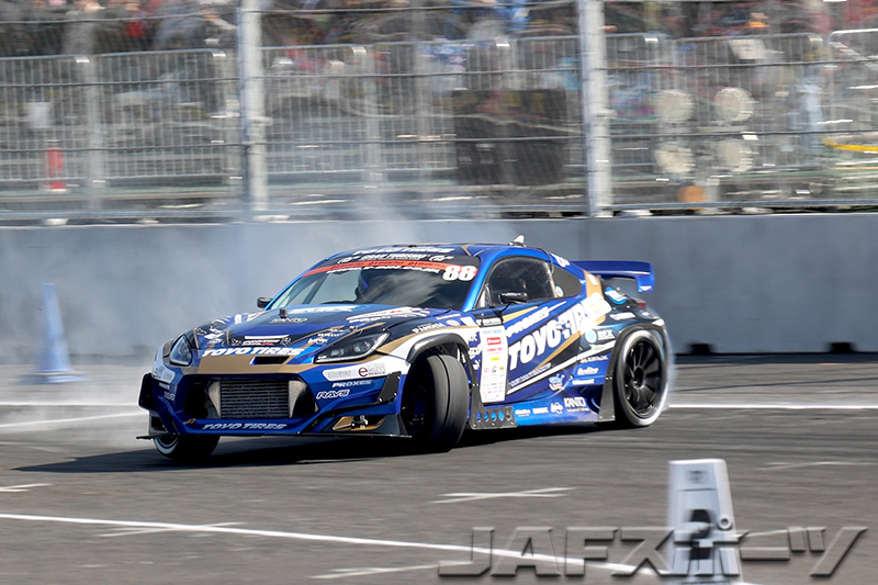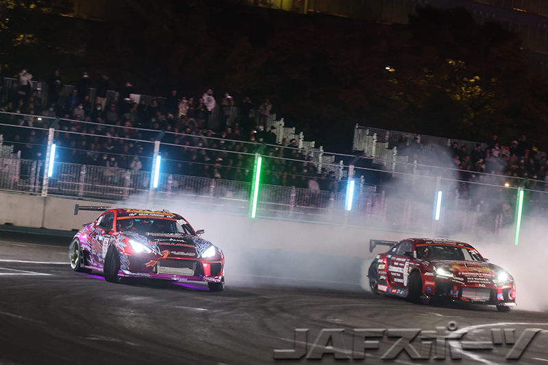 舞台となったお台場特設会場のコースは、基本的なレイアウトこそ去年と変わらないが、ゾーンの数を増やして難易度がアップした。横井昌志選手(TEAM D-MAX RACING)、川畑真人選手(Team TOYO TIRES DRIFT 1)、村上満選手(Repair Create × Result Japan)、齋藤太吾選手(FAT FIVE RACING)、田野結希選手(Team TOYO TIRES DRIFT 2)ら表彰台経験者が軒並み苦戦して予選不通過となる中、中村直樹選手(TEAM VALINO × N-STYLE)、日比野哲也選手(SHIBATA RACING TEAM)が98点台で1、2位に立つ。しかし、最後の組で出走した藤野秀之選手(Team TOYO TIRES DRIFT 1)は、それを上回る得点で単走優勝を奪取して貴重な4ポイントを加算。蕎麦切広大選手(SHIBATA RACING TEAM)は10位で通過はしたもののノーポイント。この時点で両者のポイント差は16に縮まった。ギリギリまだチャンピオンの希望を残す目桑宏次郎選手(VALINO TEAM G-Meister)も98点台で予選通過した。