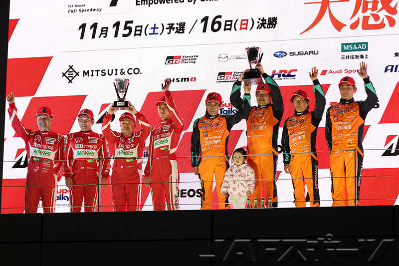 2番手を走行していたDAISHIN GT-R GT3は終盤にオルタネーターのトラブルでピットイン。これでseven × seven PORSCHE GT3Rは楽になり、辺りがすっかり暗くなった17時15分に2番手に57秒の差を付けてトップチェッカー。今季5戦目の参戦で4勝目を挙げ、参戦初年度に逆転タイトルを確定した。2位はTKRI松永建設AMG GT3(DAISUKE/片岡龍也/奥本隼士/中山友貴組)、3位はD’station Vantage GT3(星野敏/藤井誠暢/上村優太組)だった。