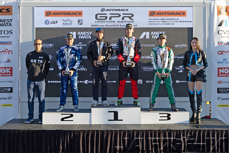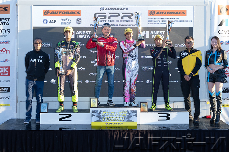 タイムトライアルでは7台がコースレコードを更新する中、スポット参戦の植田晴斗選手が47秒449のトップタイムを叩き出すも、第9戦のウィナーは伊藤聖七選手。3番グリッドからのスタートではひとつポジションを下げたが、そこから前を行く3台を抜いて折り返し点でトップに立ち、後半戦を独走して今季3勝目を飾った。伊藤選手はこの勝利でGPR2025シリーズの同クラス王者に輝いた。2位は小熊孝誠選手、3位は東拓志選手だった。