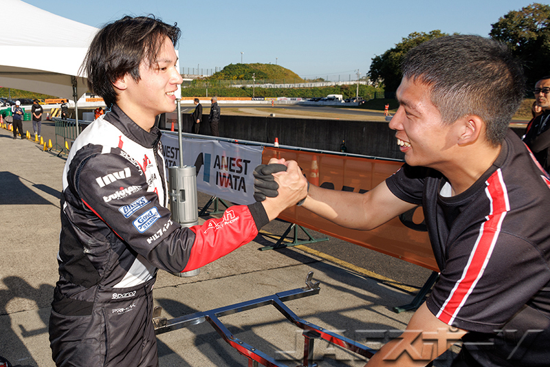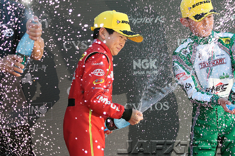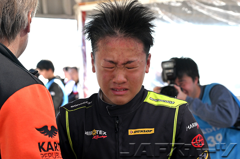 酒井龍太郎選手はピットサインレーンで見守るチームの仲間たちに勝利のポーズを示しながら、今季3勝目のチェッカーをくぐり抜けた。レースに“もしも”はないのだが、もし酒井龍太郎選手がリタイアの悔し涙に暮れた第9戦を酒井仁選手より上位で走り切っていたら、王座は酒井龍太郎選手のものになっていただろう。