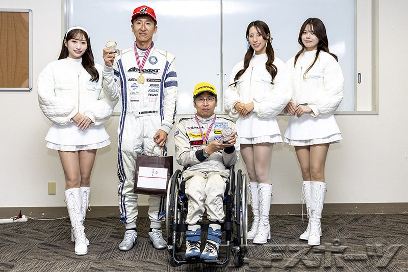 目標としていたパーフェクトな4冠を見事、達成した松橋選手は「昨日、JAF表彰式を終えてから新幹線に乗ってバタバタとしてしまいましたが、無事勝てて良かったです。第1ヒートは路面がベストじゃない、スティント最後になるほど路面ができあがっていく、でもクリアラップがとれない、というジレンマがありましたね。(2026シーズンの)JAFカップで良いリアタイヤをつくるために、新品のタイヤを投入したんですが、それがちょっとアタマの入りをモタつかせた感じです」と、決勝タイムをマークした1回目の走りを振り返った。