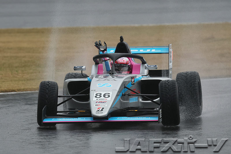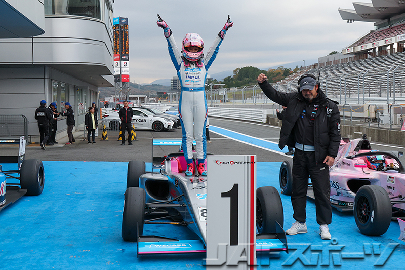一方、隊列先頭では下野選手が好ペースで周回を重ね、独走状態でレースは12周目に突入。最終的に約9.4秒のギャップを築いて今季8勝目を飾り、フォーミュラ初年度の最終レースをトップで締めくくった。2位は翁長選手、3位は斎藤選手となり、9位でレースを終えた細川選手は今季初入賞を果たしている。