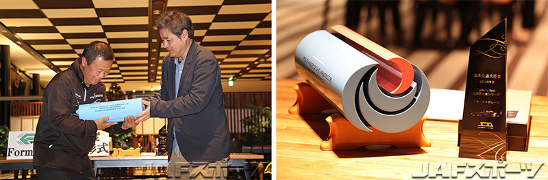 また、優秀な技術者やレーシングカー製造者、自動車産業が育つ環境構築のために国土交通省がエールを送る国土交通大臣賞は、優れたレーシングカー開発技術を評価し、全15戦で得たポイントの合計数が最も多かった、酒井選手が駆ったファーストガレージFG108が受賞。国土交通省のロゴを模した重厚なオブジェとトロフィー、賞状が贈呈された。