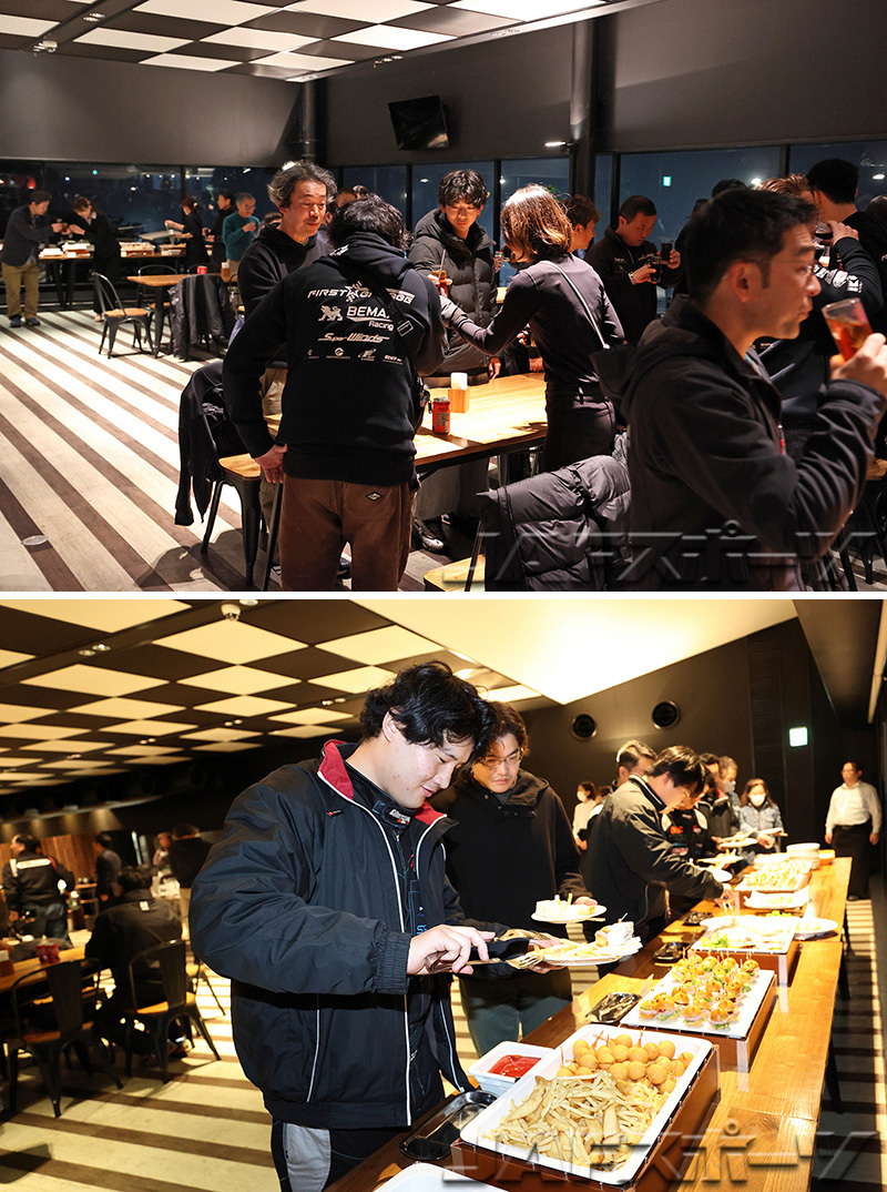 続いて来賓を代表して、住友ゴム工業株式会社の安岡生人氏と、新興工業株式会社の笹沼靖憲氏、autosport編集長の田中康二氏が挨拶した。田中氏は「私は、かつてF4と呼ばれる時代に、このレースに出てドライバーになることを夢見ていました」と、自身のドライバー時代を明かし、会場にはどよめきが起こる場面もあった。その後、乾杯の音頭を皮切りに軽食などがふるまわれた。