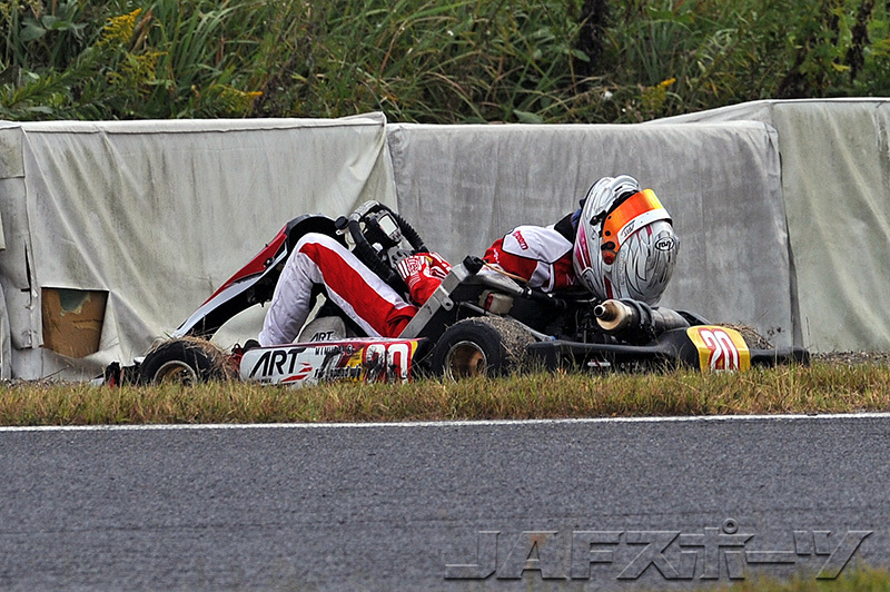 そんな中でもとりわけ悪夢のような記憶として脳裏に残っているのが2012年、三重県鈴鹿市の鈴鹿サーキット南コースでの全日本カート選手権 KF1部門最終戦(第9戦)のことだ。三村選手はポイントリーダーとして大きなアドバンテージを持った状態でこのレースに臨み、本調子ではないながらも自力チャンピオン獲得圏内の6番手あたりを走っていた。