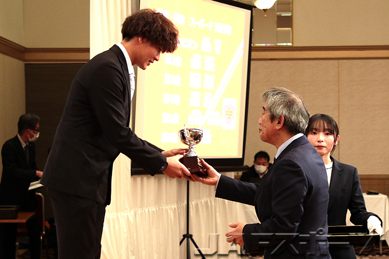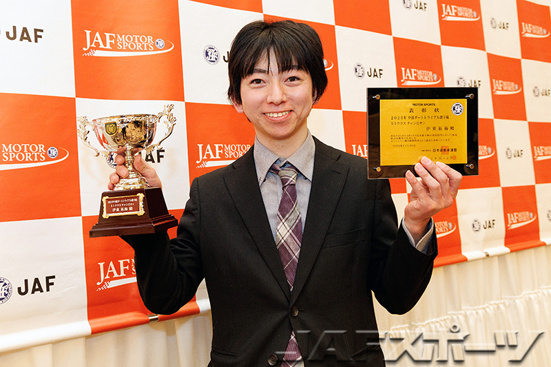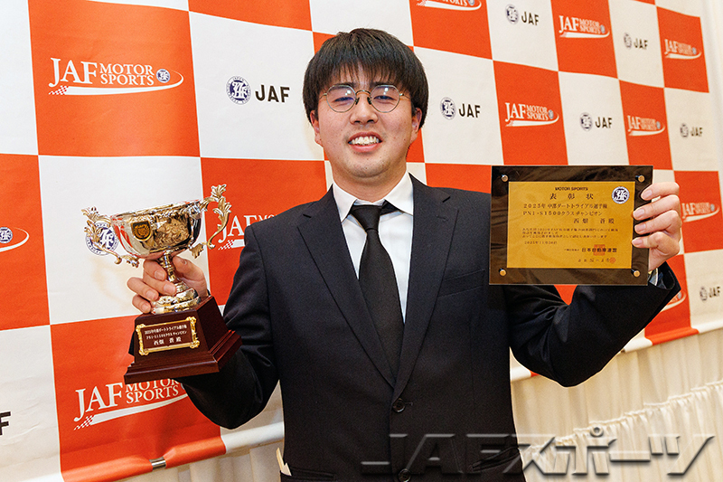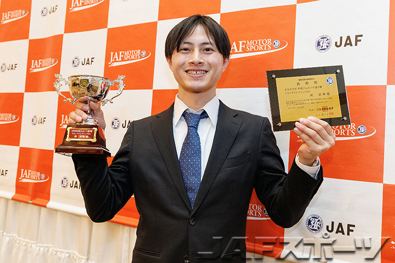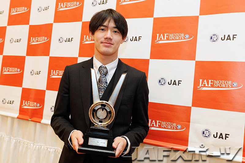 各競技ごとに2025年を振り返るショート動画が映し出されて賞典の授与がスタート。最初は2025年11月28日に行われたJAFモータースポーツ表彰式の後に最終大会を迎えた全日本スーパーフォーミュラ・ライツ選手権の表彰だ。ドライバーチャンピオンの野村勇斗選手が登壇し、JAF中部本部の稗田事務局長からVトロフィーを誇らしげに受け取った。